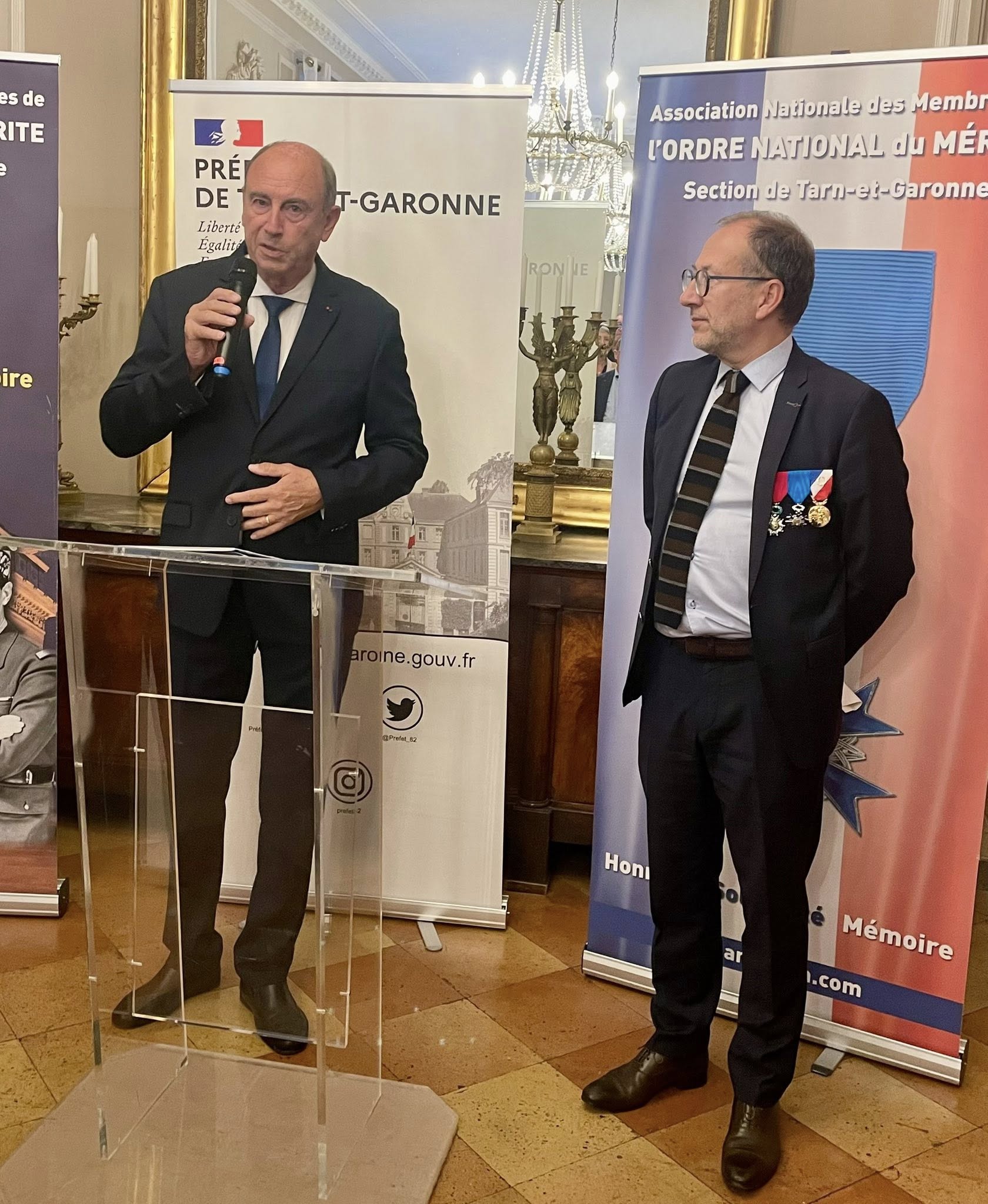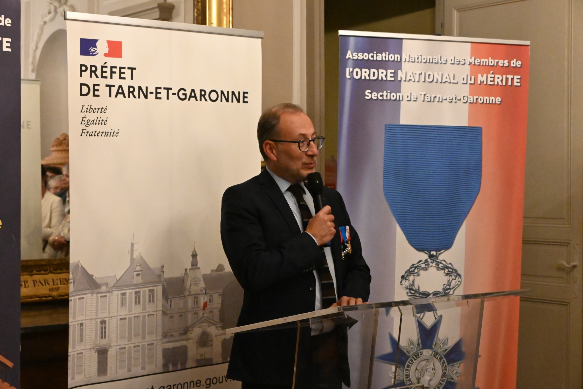 La cérémonie a débuté par une allocution du Général MOULINIÈ, membre du comité de section de l’Association Nationale des Membres de l’Ordre National du Mérite (ANMONM82). Il a rappelé l’origine de cette distinction, créée en 1963 par le Général De GAULLE, afin de récompenser les mérites civils et militaires. « Cet ordre vise à honorer ceux qui, par leur engagement, servent l’intérêt général et incarnent les valeurs de la République », a-t-il souligné.